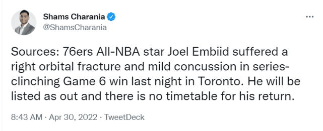 24直播网04月30日讯 ,76人官方宣布,全明星恩比德在昨天对猛龙的G6一战中右眼眶骨折和轻微脑震荡,他目前被列为“缺阵”的状态,名记查拉尼亚表示他暂无复出时间表。