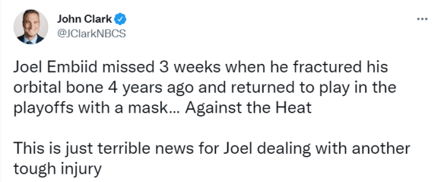 恩比德是在G6最后时刻受伤的,当时西亚卡姆打到了恩比德的面部,他当时就捂着脸走到场边,非常痛苦。赛后西亚卡姆对恩比德道歉,但没想到造成的伤害这么严重。