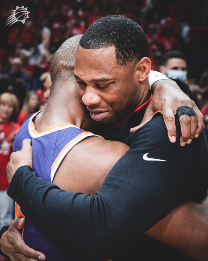 24直播网04月29日讯 ,鹈鹕G6主场惜败,系列赛大比分2-4被太阳淘汰出局,鹈鹕出局后,威利-格林情绪激动,拥抱保罗时泪流满面,鹈鹕主帅哭泣的画面太感人;赛后太阳官方晒出这一幕,发推写道:我们都爱你,威利,伟大的系列赛。