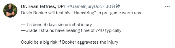 布克腿筋拉伤后已经养伤一周多,医学专家Rajpal Brar表示,这是腿筋一级拉伤休战一周的时间相吻合;另一医学专家Evan Jeffries表示布克将在赛前热身测试腿筋,腿筋受伤后的第9天,一级拉伤的愈合时间是7-10天,复出可能有伤势加重的风险。