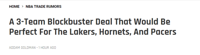 美媒认为这笔三方交易方案能让湖人、黄蜂、步行者各取所需,达到三赢的效果。方案具体内容如下——
