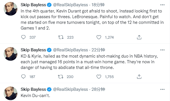 Skip还发推:这个星球上最好的篮球运动员,凯文-杜兰特,被波士顿凯尔特人打得生活不能自理;还直言杜兰特是凯文-杜难射。