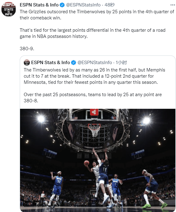 本场比赛,灰熊开场被森林狼打出12-0的超级攻势,之后贝恩连续命中两记三分,莫兰特也中三分,灰熊不断迫近比分;不过灰熊突然又断电,森林狼打出14-3攻势从而第一节39-21领先18分。