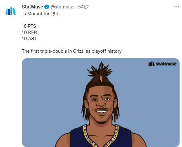 莫兰特成为灰熊队史第一位在季后赛拿到三双的球员,该纪录队史第一人;灰熊成为NBA历史近25个赛季第9次季后赛25+逆转赢球,末节赢25分创NBA季后赛历史客场最大逆转赢分,并列历史第一。