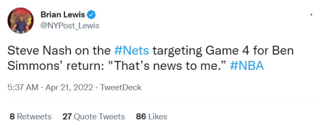 纳什明确表态,要到西蒙斯自己感觉可以出战了,他们才会安排他上场。毕竟西蒙斯已经缺席很长时间了,他们不想操之过急。G2赛前,当 他被问及西蒙斯目标G4复出的时候,纳什调侃道:“这对我来说都是一条新闻。我不认为我们会把目标定在某场比赛……我们中的任何人都不会说这(西蒙斯复出)是迫在眉睫的事。”乌度卡自信绿军队员都熟悉本西:“他的复出不是问题。”