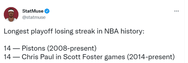 虽然这场比赛的判罚没有什么大问题,但保罗还是延续了福斯特魔咒,目前已经是14连败了!美媒StatMuse直接晒出数据调侃起保罗:“NBA季后赛史上的最长连败纪录,14连败-活塞(2008年至今),14连败(保罗参加福斯特执哨的季后赛,2014年至今)。”