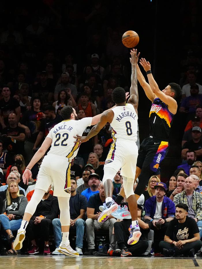 第二节,太阳和鹈鹕打得依旧胶着,5分22秒布克重新上场,里突外投再次火力全开,外线三分神准,半场0.8秒超远三分点燃球馆,单节又轰下15分,半场投进7记三分轰下31分;不过布克超神,太阳半场仅领先5分。