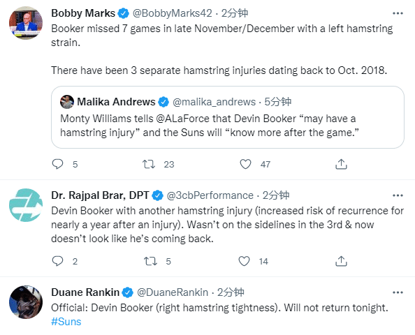 为何布克突然不打了?太阳主帅蒙蒂表示布克的腿筋不适,之后太阳官方布克因右腿筋紧张而退出比赛;布克曾多次遭遇腿筋伤势,但愿布克伤势别太严重。