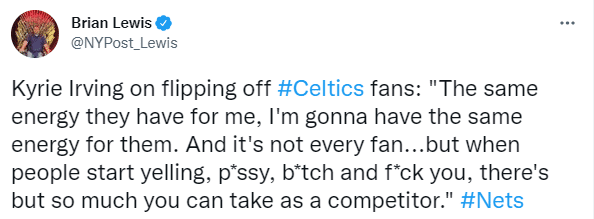 比赛期间,第三节欧文投进大号两分后,冲着绿军球迷竖中指,有球迷怒骂欧文,后者背对着球迷竖了两个中指;末节欧文连续得分,带领篮网15-2反超比分,第四节7分46秒比赛暂停时,镜头拍到欧文摊手并且做出哭脸状;欧文回应绿军球迷的行为,恐怕会被联盟追加罚款,竖中指的行为至少被罚1.5万美元。