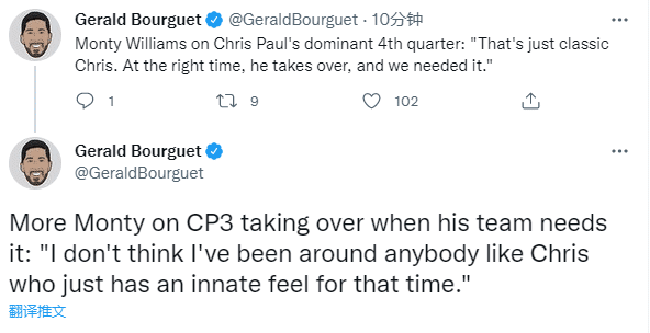 谈到保罗的表现,太阳主帅蒙蒂表示:这就是经典的克里斯,他在正确的时间接管了比赛,这也是我们需要的。