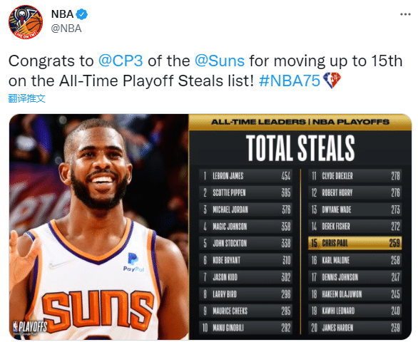 第一、保罗季后赛盖帽数达到259次,超越卡尔-马龙(258次)升到历史第15位,排在保罗前面的一位是湖人名宿费舍尔(272次抢断)。