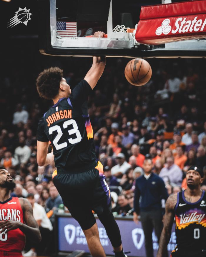太阳防守令人窒息,布里奇斯生抢造争球,鹈鹕24秒进攻违例,布克突破上篮,艾顿大帽瓦兰,英格拉姆肘击对手吃到进攻犯规,约翰逊投进三分,太阳攻防两端统治比赛,半场53-34领先鹈鹕19分。