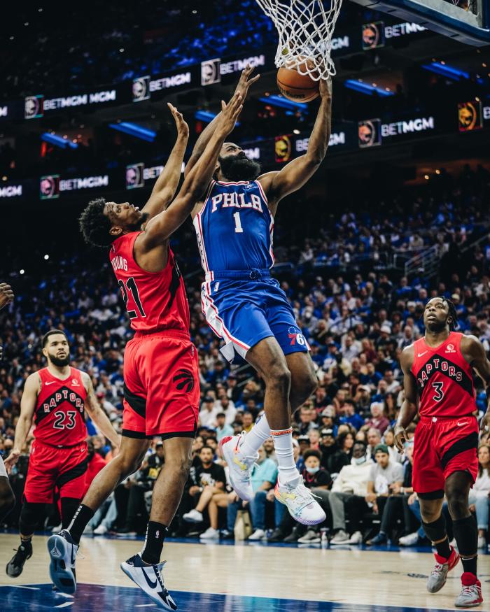 第二节猛龙5-0追分,哈登强硬突破上篮,外线单挑后撤步三分也有,76人领先到10分;恩比德、马克西和哈里斯也输送火力,76人单节34-24净胜10分,半场结束领先18分;期间恩比德防守时打到巴恩斯的面部,吃到一级恶意犯规。