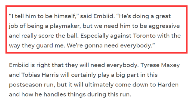 不能只传球!恩比德希望哈登对阵猛龙打出侵略性:场均仅15分