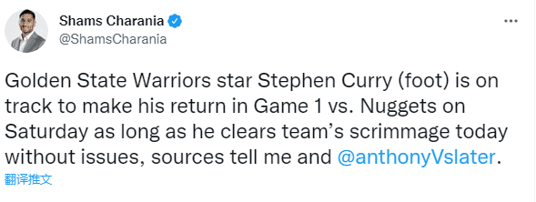 勇士季后赛重大利好,据名记Shams报道,若库里今日在队内5v5混战训练中感觉良好,那么预计他将在对阵掘金的系列赛首场比赛中完成复出,库里本人的目标也是首轮G1重返赛场,也是时隔3年重返季后赛。