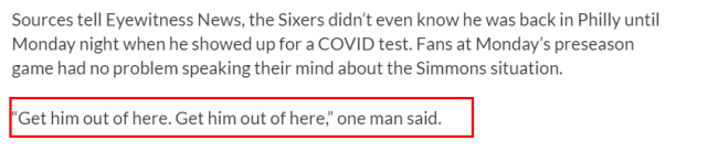 听到西蒙斯回到费城的消息,76人的球迷的反应也是多种多样。一部分球迷依然在喷他,甚至情绪更加激烈,有球迷说:“让他离开这里!让他离开这里!”也有一部分球迷在支持他,希望他能回来继续打球。