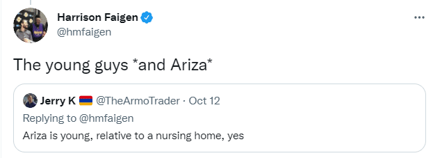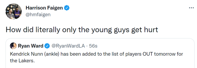 湖人记者哈里森-费根转发了伤病报告,感慨道:“为啥只有年轻人受伤了?”有球迷指出对比养老院,阿里扎确实算年轻人时,费根更正道:“年轻人和阿里扎。”