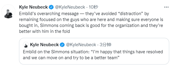 乔尔-恩比德还说,自从上赛季结束以来,他就没有和本-西蒙斯谈过话,恩比德说他曾尝试找西蒙斯沟通,但最终失败了;此前西蒙斯曾拒绝与恩比德等队友到洛杉矶与其见面;恩比德还表示我们都想赢,西蒙斯的归队给了我们最好的获胜机会,这就是我想要的,这对球队有好处。