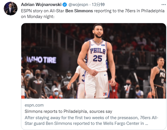 经过一番谈判,西蒙斯已经抵达费城,并且接受新冠检测,结束隔离之后他将归队报到,老里更是透露西蒙斯将参加训练,76人更是希望西蒙斯能继续为球队效力。