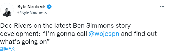 对于西蒙斯抵达费城并且即将归队,76人主教练里弗斯调侃道:“我准备给沃纳罗斯基打个电话,问问他最新情况到底怎么样了。随后老里还表示预计西蒙斯能够参加本周的训练。