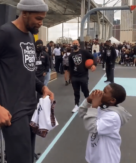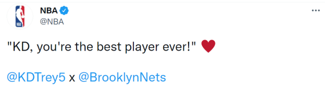 如果单纯看这句话,可能会误解官方的意思,但实际上,官方这句话的下方还配了一个视频。一个看上去七八岁的孩子,冲着身前的杜兰特喊道:“KD,你是有史以来最好的球员!”杜兰特笑着回应道:“谢谢你!”看这后续动作,杜兰特打算送给这孩子一件签名球衣。