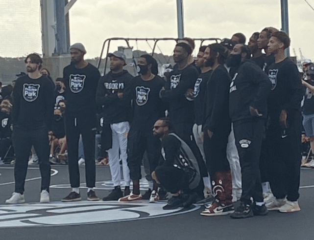24直播网10月10日讯 ,篮网全队在布鲁克林大桥公园举办户外训练,欧文终于归队并且戴口罩参加训练,杜兰特和欧文拥抱喜笑颜开,哈登也是满脸笑容;训练之余,篮网全队拍摄合影,杜登都是靠边站,其中哈登体型臃肿貌似又胖了。