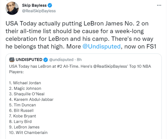 24直播网10月09日讯 ,NBA知名评论员斯基普-贝勒斯在节目上谈论《今日美国》的75大巨星排名。《今日美国》将詹姆斯排在历史第二,仅次于乔丹,而贝勒斯公布了自己心中的前十排名,詹姆斯竟然只被他放在第九。