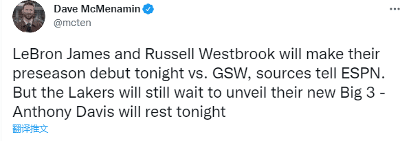 24直播网10月09日讯 ,湖人两大巨头詹姆斯和威少确定出战勇士,湖人记者Dave McMenamin他俩都会参加今天的比赛;此前詹姆斯和威少已经连续轮休两场,而今天湖人对阵勇士,詹姆斯将迎来湖人6号生涯首秀,威少则是迎来紫金生涯首秀,但浓眉轮休,湖人三巨头合体还需等待。