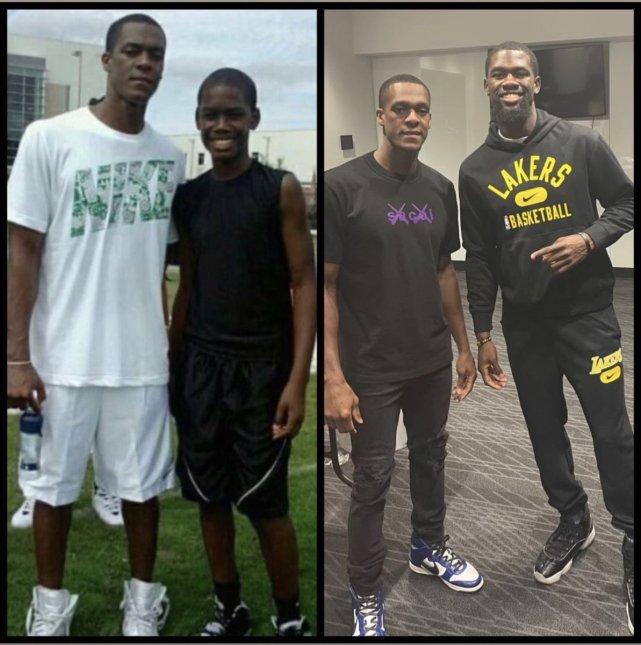 24直播网10月08日讯 ,湖人新援昌迪-布朗更新社媒,晒出了自己和朗多的两张合影。一张显然拍摄于多年前,还是一个孩子的布朗是朗多的粉丝,他比偶像矮半头。而另一张拍摄于现在,成为湖人队一员的布朗,已经比朗多高出半个头了。昔日的粉丝与偶像,如今效力于同一支球队,成为队友。