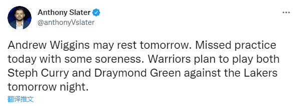 维金斯右膝拉伤至少伤停一周,勇士记者AnthonySlater还报道,勇士球员安德鲁-威金斯因为身体酸痛将会缺席明日的比赛,勇士计划让库里以及德雷蒙德-格林出战。