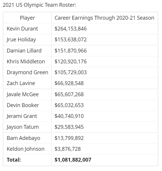 再来看看美国这届奥运男篮的生涯总收入情况,虽然他们是各自球队的当家球星,但和新赛季的湖人相比,生涯薪水还是明显不如。美国奥运男篮只有一名球星的生涯总薪水突破2亿美元,他就是篮网球星杜兰特(2.64亿)。除了杜兰特,另有四位球员突破1亿美元,他们分别是霍乐迪、利拉德、米德尔顿和格林。拉文、麦基、布克都还没突破7000万。美国奥运男篮的生涯总薪水大概是10.8亿左右。