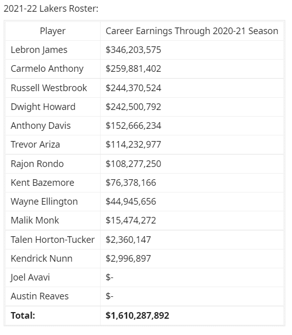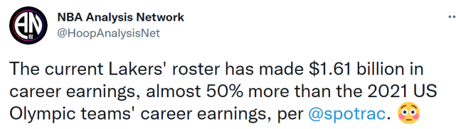24直播网9月13日讯 休赛期,湖人通过一系列运作,打造了一套星光熠熠的豪华阵容。北京时间9月13日,美媒spotrac统计了湖人现有阵容的生涯总收入(只含NBA薪水),累计达到16.1亿美元!这是什么概念,他们还列出了东京奥运的美国男篮阵容生涯总收入(10.8亿美元),这支湖人能超过他们近五成。