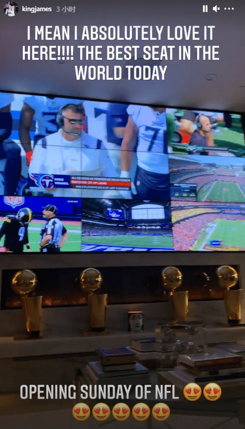 今天詹姆斯在家中观看NFL揭幕战,用一个大屏幕同时观看多场比赛,屏幕下方摆放着4座金光闪闪的NBA总冠军奖杯,直言:我爱这里,今天我拥有世界上最好的座位。
