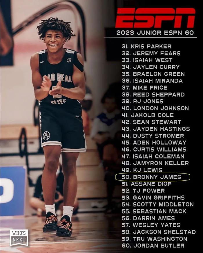 24直播网9月12日讯近日,ESPN更新了2023届全美高中生排行榜,令人瞩目的詹姆斯大儿子布朗尼,仅仅只排在了第50名,非但没有步入五星高中生行列,恐怕连四星高中生的身份也难保了。