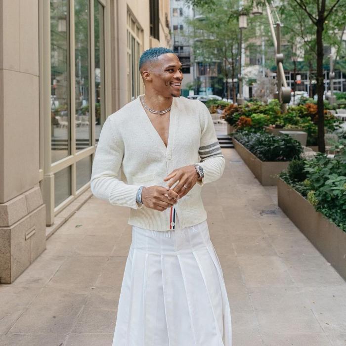 32岁威少上半身穿着白色开衫,露出一点胸肌,还戴着一串珍珠项链;下半身穿着白色长裙,搭配黑色皮靴,站在街头拍摄艺术照,在室内拍照时,威少冲着镜头比V十分开心,头发颜色也十分抢镜;威少如此打扮引热议,众所周知,威少是NBA的潮流引领者,经常在赛前穿出与众不同的服装,露出胸肌已成常态。