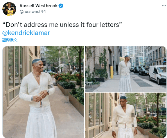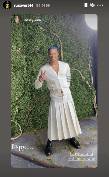 威少白裙子+黑皮靴的潮流照引热议,湖人另一新援蒙克在评论区留言:与众不同;前湖人球员杜德利则留言:Brodie威少绰号!!!!!!!!配上4个笑哭的表情。