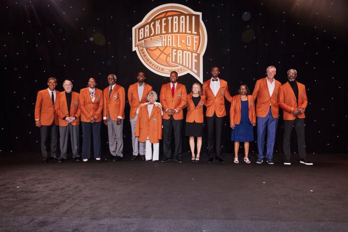 24直播网9月11日讯 ,2021年奈史密斯名人堂大合影来了,名人堂官方晒出众人合照,都穿着象征荣誉的名人堂橙色外套,并且戴着名人堂戒指。