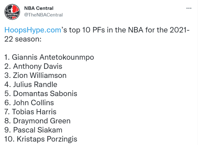 24直播网9月11日讯 ,继组织后卫、得分后卫和小前锋之后,知名美媒HoopsHype又公布了新赛季的大前锋排名。雄鹿的字母哥高居第一,湖人的浓眉排名第二。
