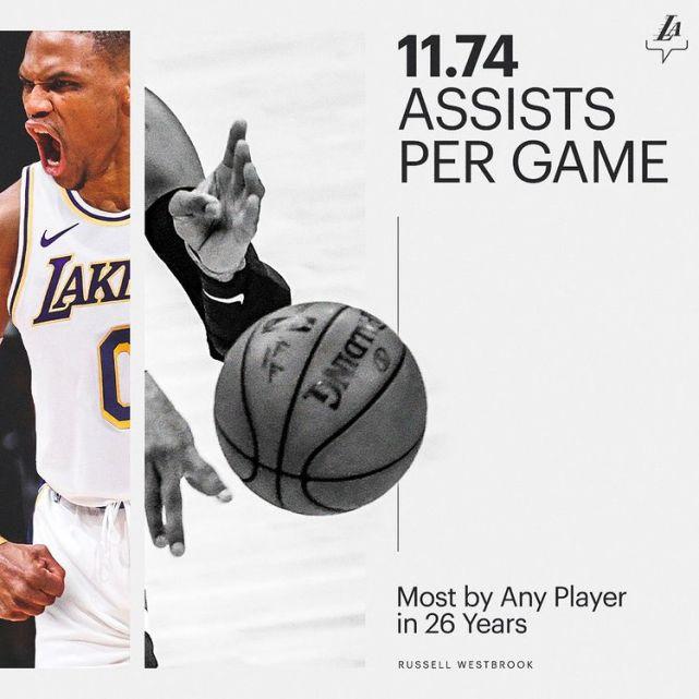 24直播网9月11日讯 湖人官方晒出了新援威斯布鲁克的一项数据。数据显示,威少上赛季场均送出11.74次助攻,是近26年来的最高值。