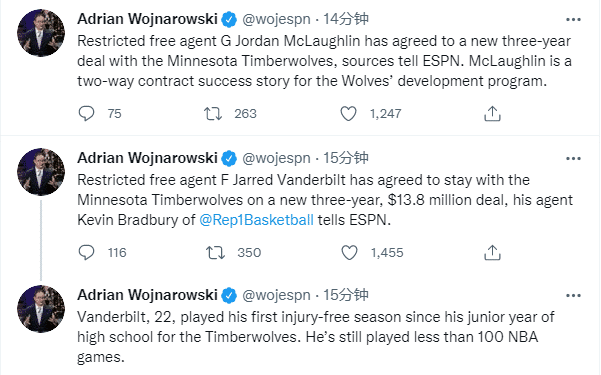 24直播网9月11日讯 ,据espn名记沃纳罗斯基报道,森林狼连续签约两名球员,3年1380万美元续约范德比尔特,3年650万美元续约麦克劳林,双向合同球员终于获得正式合同。
