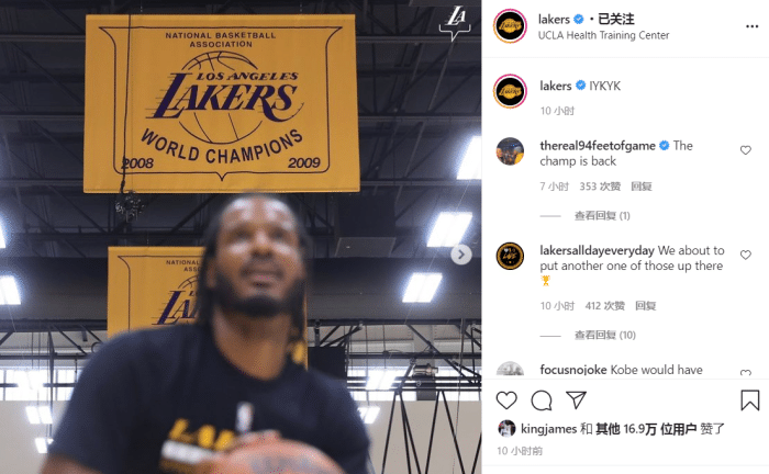 24直播网9月10日讯 湖人官方今天在社媒上晒出了一张阿里扎的训练图,而阿里扎背后上空挂着的正是紫金军团09年的冠军旗帜。湖人官推配文写到:懂的都懂!值得一提的是,詹姆斯和霍华德都点赞了这条动态,很多球迷表示对此爷青回!