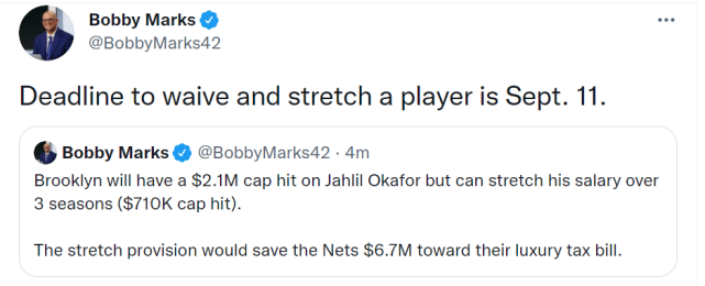 薪金专家鲍比-马克斯表示,篮网可以分3个赛季延期支付奥卡福约210万美元的薪金,每年71万美元。这样可以帮助篮网节省670万的奢侈税。这一操作的截止日是当地时间9月11日。
