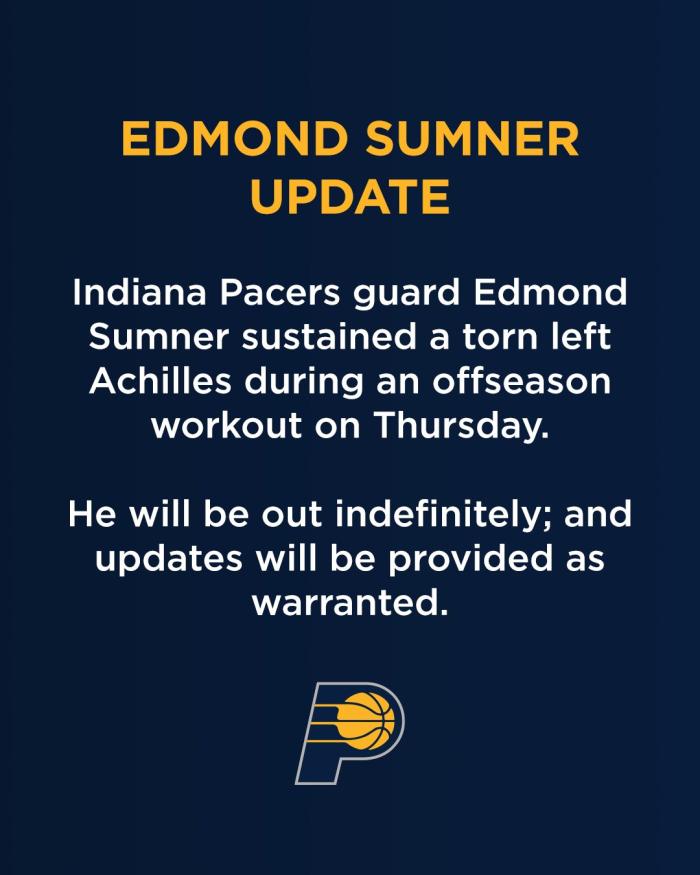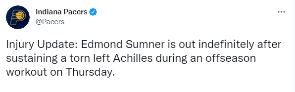 24直播网9月10日讯 ,印第安纳步行者队又有坏消息,步行者官宣,由于在训练中遭遇左脚跟腱撕裂的伤病,埃德蒙-萨姆纳将会无限期休战;步行者新星惨遭跟腱撕裂的重伤,遭遇汤神式悲剧,或提前赛季报销。