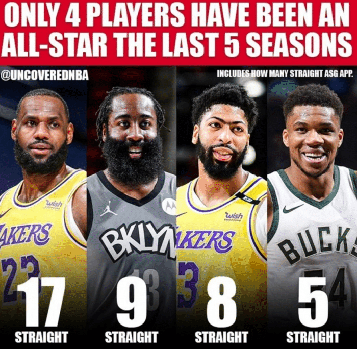 24直播网9月09日讯 能够入选NBA全明星阵容的球员,实力自然属于联盟顶级行列。不少NBA运动员,能够入选一次都非常不易。如若可以多次入选,那自然是不小的成就。那么现役球员中,在过去五年都能连续入选NBA全明星的都有谁?美媒近日也是进行一番统计,符合条件的现役球员只有四人,而这其中湖人就占了两人。杜兰特库里两大超巨无缘。