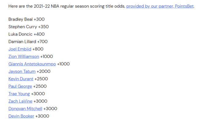 24直播网9月08日讯新赛季关于总冠军的归属,关于常规赛MVP的归属,都是人们讨论和关注的话题。当然得分王也是大家所为之关注的焦点,那么最新一个赛季,哪名球员最被看好成为得分王呢?新赛季得分王赔率最新出炉,排名第一的是来自奇才的比尔,力压NBA众多球员排在这一榜单第一名,赔率为+300。