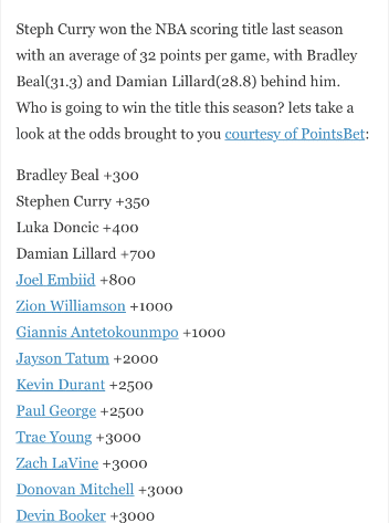 24直播网9月08日讯 还有一个多月时间,NBA新赛季将会正式开始,等待了几个月时间的球迷们早就已经是迫不及待了,大家都希望看到球星们在赛场上大放异彩的样子。对于常规赛阶段,大家最关心的事情除了常规赛战绩之外,各类常规赛奖项也能引起注意。其中得分王无疑是一个十分重量级的个人奖项,而这个奖项每一年的获得者都有可能不同。近日就有媒体给出了NBA新赛季的得分王赔率,谁才是最有可能拿到得分王的球员呢?
