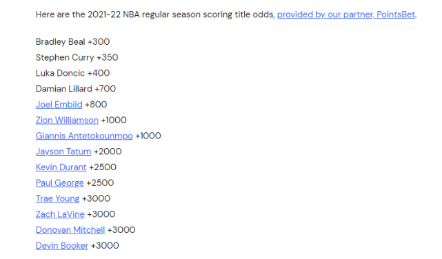 24直播网9月08日讯 ,2021-22赛季的得分王赔率排名出炉,奇才球星比尔位居第一,库里排名第二。杜兰特仅排名第九位,而在公布的前14名中,没有湖人球员上榜。