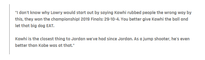 24直播网9月07日讯几天前,热火球员洛瑞参加一档播客节目,谈到了猛龙夺冠那个赛季的一些细节,对于伦纳德,洛瑞表示:“他的一些做法惹恼了队友,他会对别人说‘把球给我,我会把事情办好’。”当然,洛瑞他自己承认,虽然数据方面有所下降,但是球队最终捧起总冠军奖杯,伦纳德起到了决定性作用。日前,美名嘴斯基普贝勒斯在自己最新一档节目中强调:伦纳德是乔丹之后,NBA这几十年时间里最接近乔丹的球员,作为一名投手,他甚至比科比还要出色!