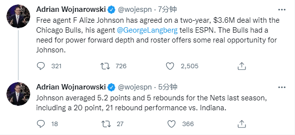 篮网弃将阿利兹-约翰逊正式恢复自由身,失业后再就业,据ESPN名记沃纳罗斯基报道,阿利兹-约翰逊已经和公牛达成2年360万美元的新合同,提升公牛锋线的阵容深度;上赛季阿利兹-约翰逊为篮网出战18场比赛,场均拿到5.2分5篮板,曾对阵步行者打出单场20分21篮板的神奇表现。