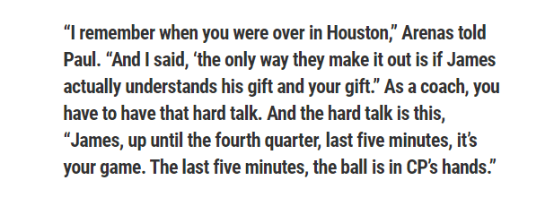 显然,阿里纳斯认为论及关键时刻的能力,保罗要强于哈登,但常规时间内的哈登,又是对手最挡不住的球星之一。